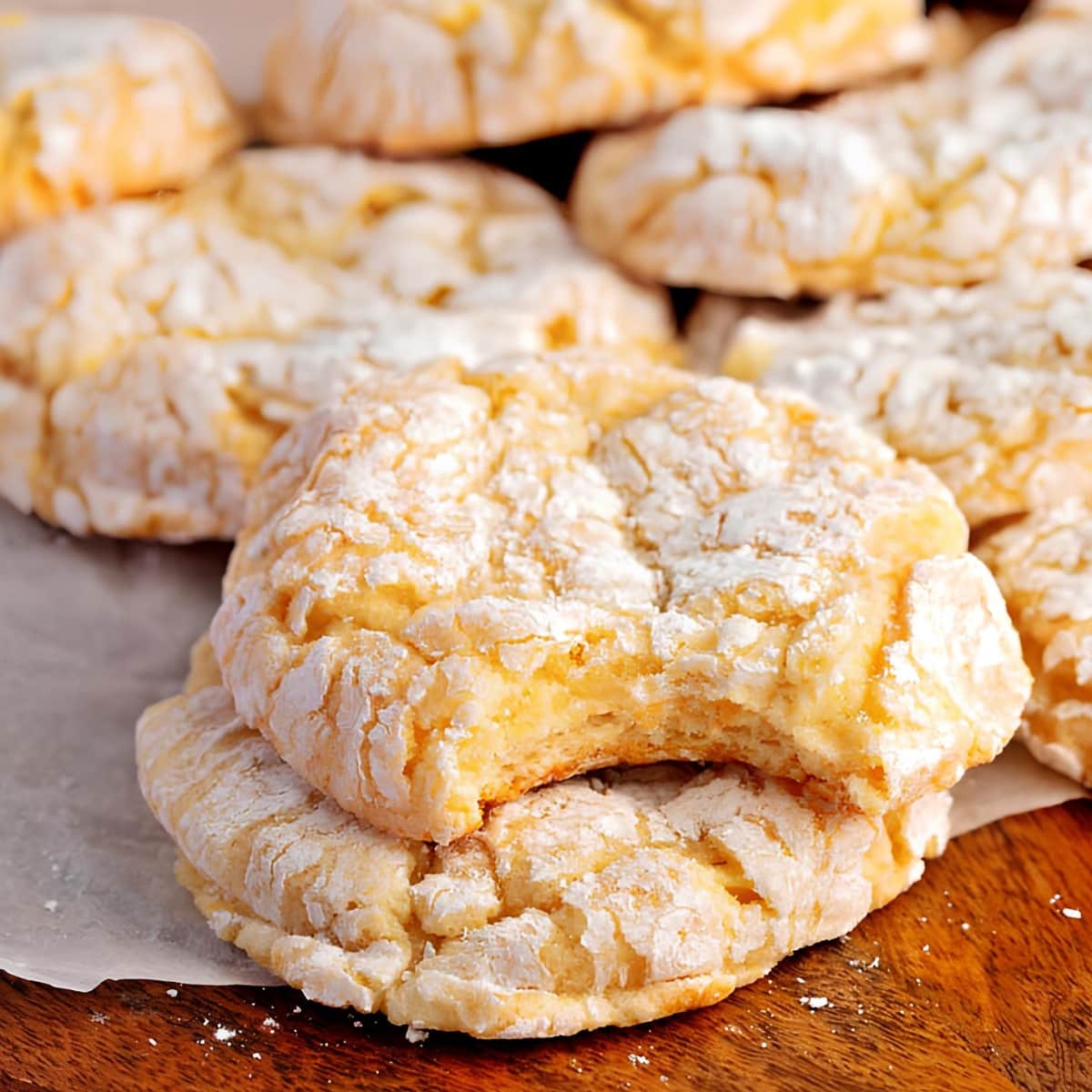Closeup of crumbly Cool whip cookies, one piece bitten.