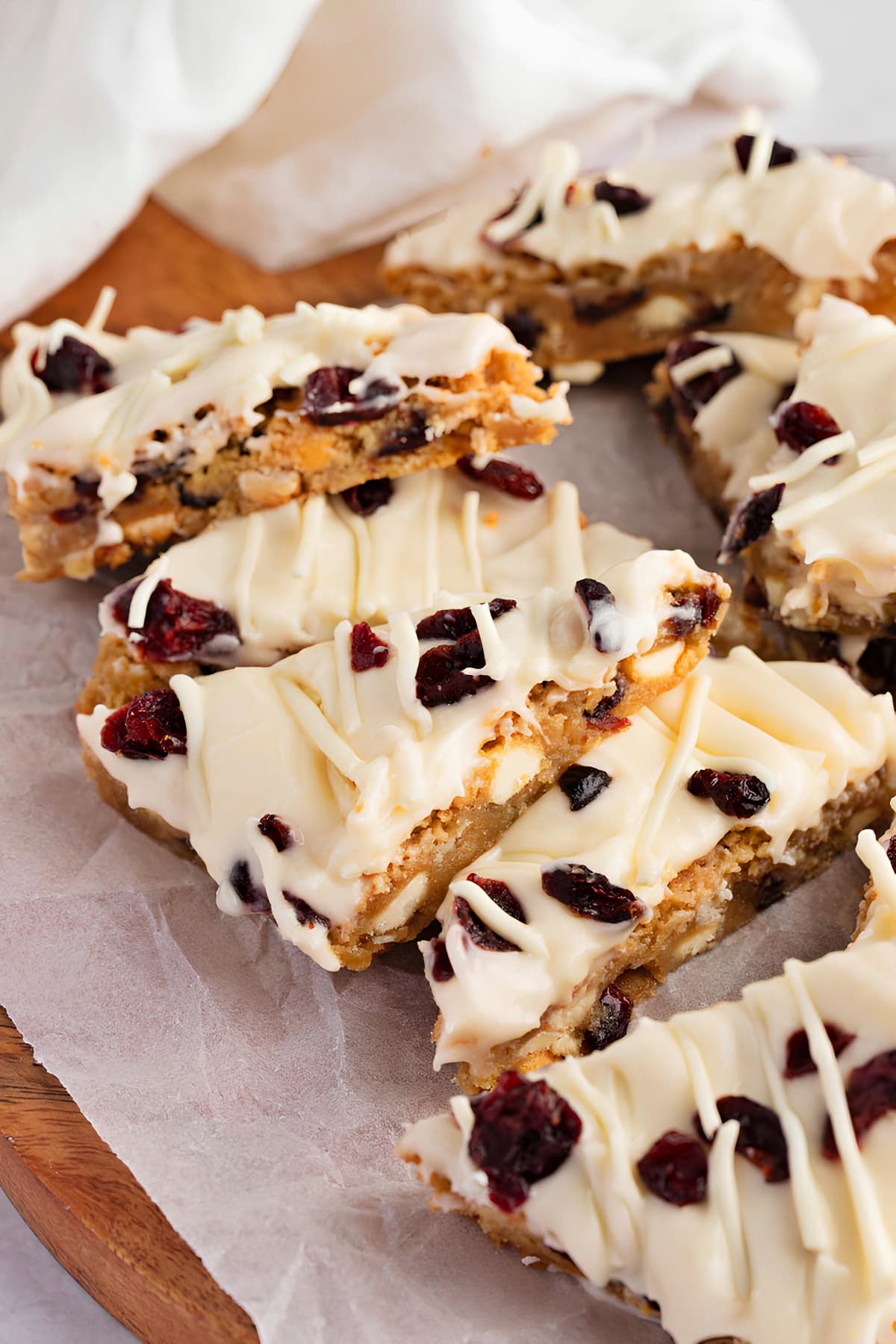 These bars are pure indulgence with tangy cranberries, decadent white chocolate, and heavenly frosting.