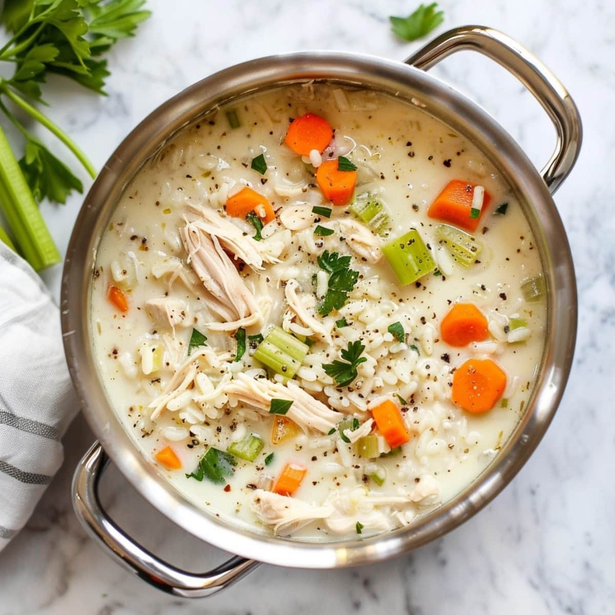 Shredded chicken, chopped veggies, and rice swim in chicken broth thickened with eggs. It’s a healthy, satisfying one-pot recipe.